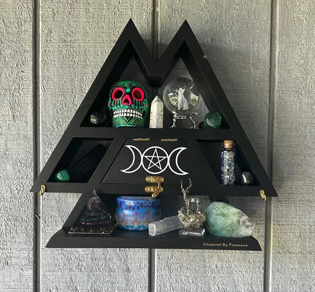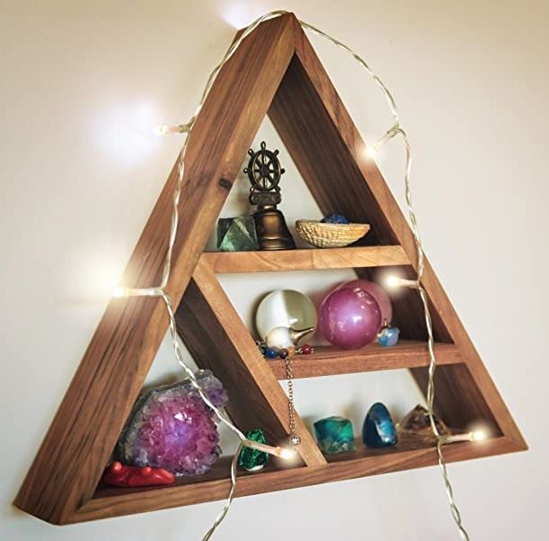 The Curawood Triangular Crystal Display Shelf is the perfect way to display and store your crystal collection. This witchy aesthetic triangle wall shelf is geometric shaped and ready to house your favorite crystals and other items. It is the perfect size to fit into any style of room, and compliments boho, farmhouse and every style in between. The 13" x 11.4" x 2.8" shelf will make your bedroom, nursery, living room or kitchen come to life with its unique triangular shape and beautiful display of your healing stones and trinkets.
