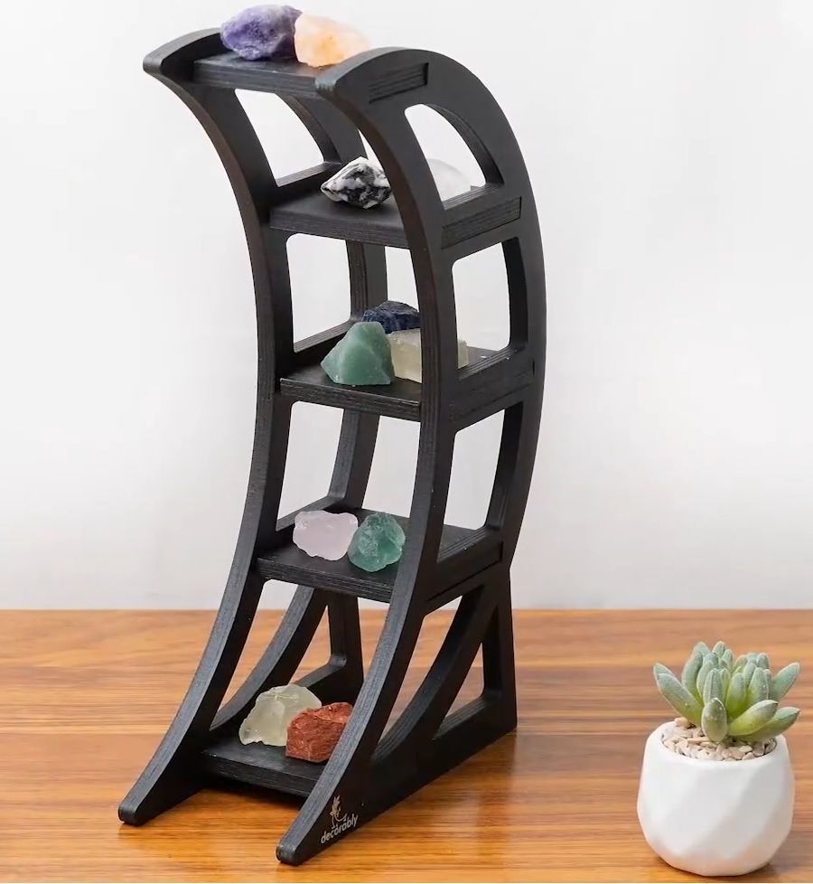 The Decorably Moon Crystal Shelf Display is the perfect way to organize your favorite crystals and spiritual items! This 5-tier storage shelf is made with quality wood and matte black latex paint, and is sturdy enough to last for years. The stylish moon shelf design keeps your items elevated and visible in modern display, and is the perfect accent for any bedroom or living room. Plus, no assembly is required, so you can start displaying your crystals as soon as it arrives!
