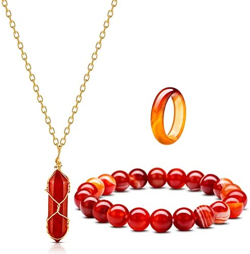 Hicarer Carnelian Crystal Jewelry Set is perfect for adding a touch of elegance and style to any outfit! The package includes a beautiful carnelian crystal necklace, a red carnelian gemstone ring and a gemstone bracelet. Red Carnelian is said to balance positive and negative energy, remove mental tension and stress, and maintain physical and spiritual harmony. It's a great choice for those who are weak or recovering.